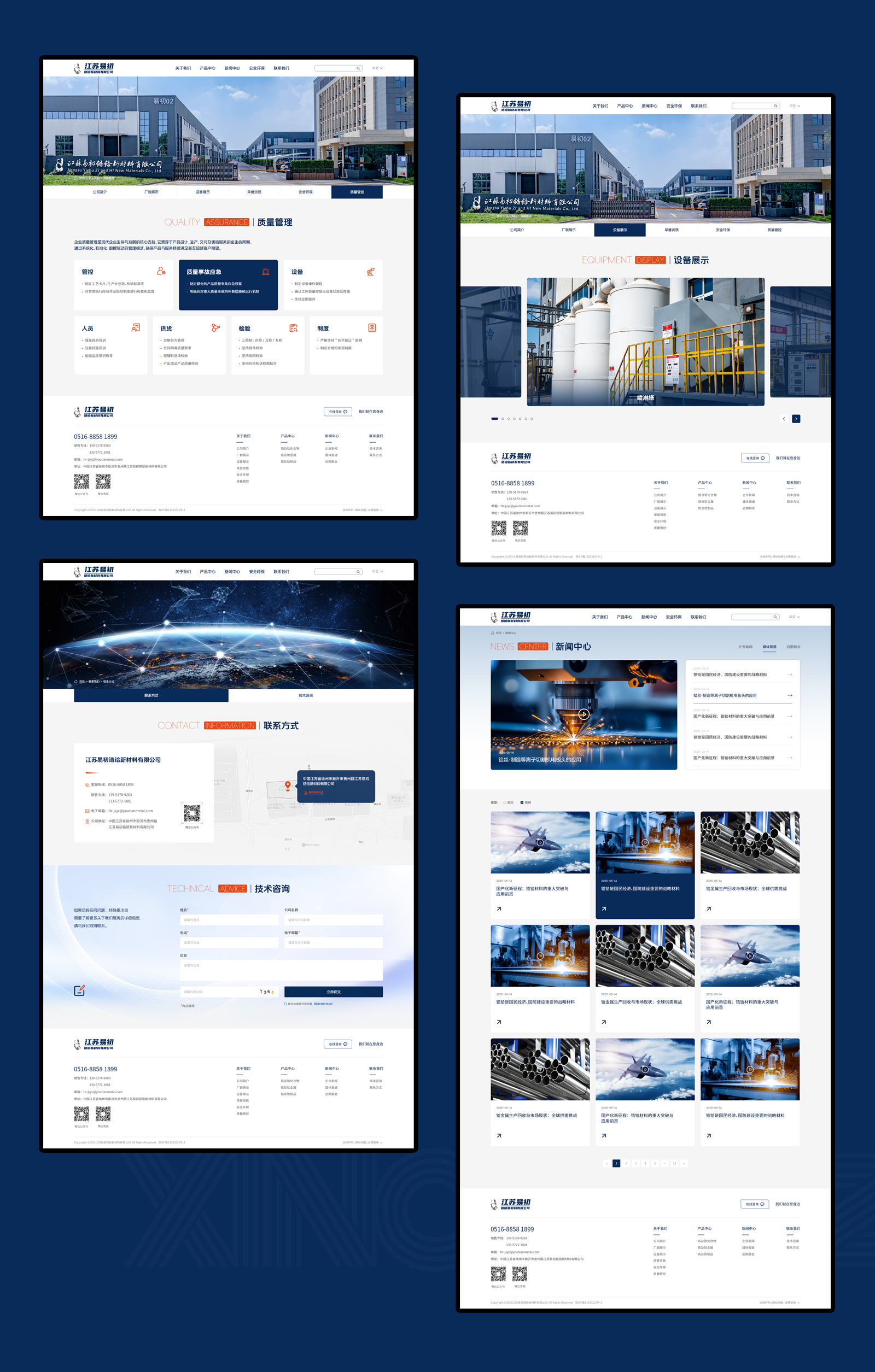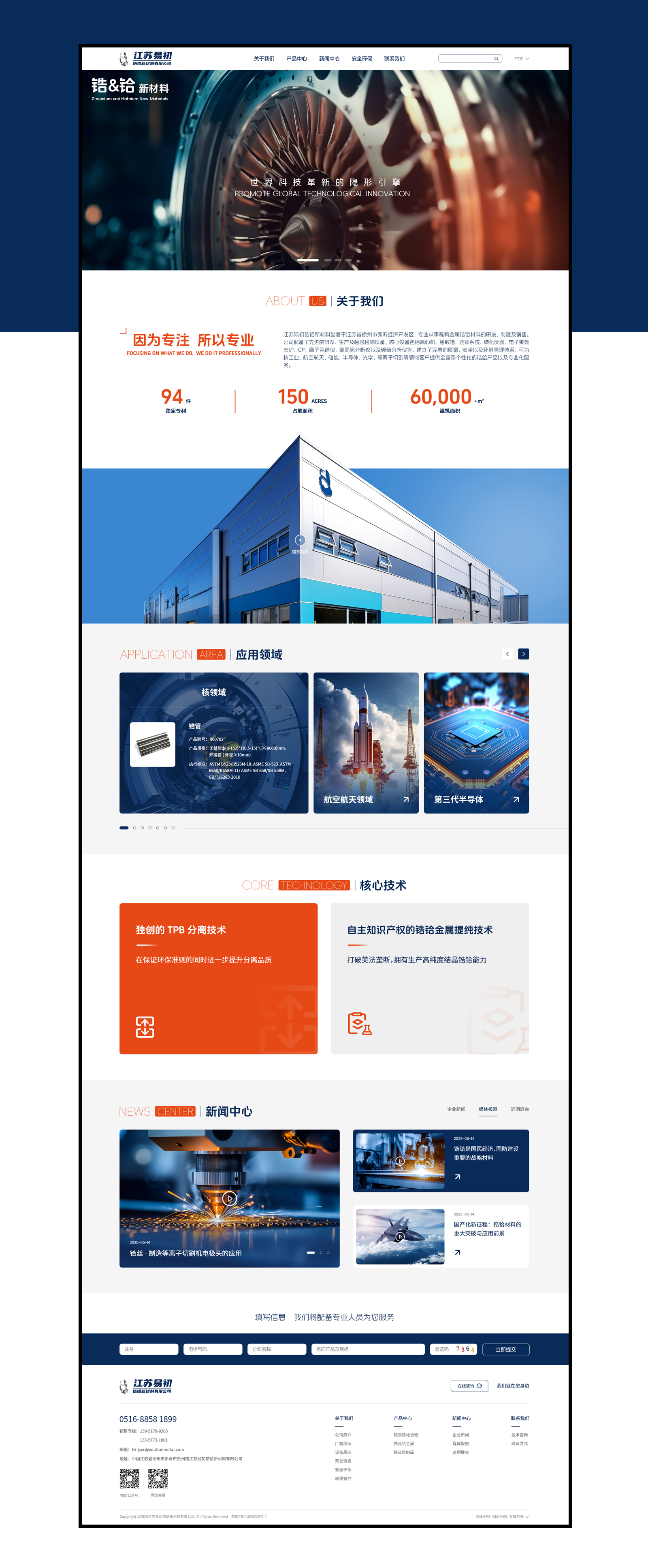 江苏易初锆铪新材料有限公司,公司成立于2019年,坐落于江苏省徐州市新沂经济开发区,2024年被认定为高新技术企业。占地面积150亩,建筑面积60000+㎡。专业从事稀有金属锆铪材料的研发、制造及销售,配备了先进的研发、生产及检验检测设备,核心设备包括离心机、萃取槽、还蒸系统、碘化反应器、电子束轰击炉、ICP、离子色谱仪、氧氮氢分析仪以及碳硫分析仪等,建立了完善的质量、安全以及环境管理体系,可为核工业、航空航天、储能、半导体、光学、等离子切割等领域客户提供全链条、个性化的锆铪产品以及专业化服务。